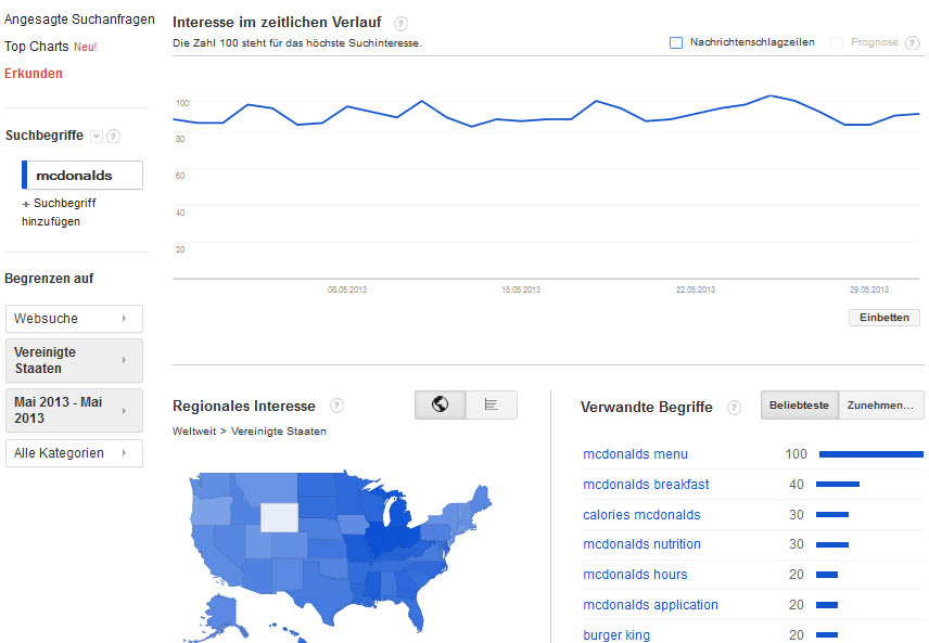 Schon vor dem Spionage-Skandal in den USA war bekannt, dass Google natürlich alle Suchanfragen speichert und „Anonymisiert“ deren Suchhäufigkeit analysieert. Mit dem Google Trends Tool kann man die häufigsten Suchbegriffe nach Themengebiet geordnet analysieren. Z.B. die Top Bücher, Filme, Stars, Edelmetalle, Automarken, Cocktails, Medikamente, Musik, uvm. Aktuell werden leider erst Suchanfragen in den USA dargestellt, weitere Länder und Sprachen sollen jedoch folgen. Neben dem Ranking werden auch weitere Werte angezeigt. So sieht man die Suchäufigkeit im Verhältnis zum Top-Suchbegriff (100 Punkte) sowie ein Trend-Index, ob der Suchbegriff häufiger gesucht wurde als im Monat zuvor. Dabei wird angezeigt wie viel Punkte der Begriff im Verhältnis zum Top-Begriff gestiegen bzw. gefallen ist. Google Trends als Tool für Aktien Spekulationen? Langzeitstudien haben bereits bewiesen, dass ein vermehrtes Suchaufkommen für Begriffe wie „Debt“ (Schulden) die langfristige Entwicklung der Börsen erahnen lässt, doch mit den Goole Trends Top Charts lassen sich auch Entwicklungen in einzelnen Branchen analysieren. Automatisierte Programme können dann die Entwicklung von Kursen mit jener der Suchanfragen abgleichen und nach möglichen Mustern durchsuchen. Für Privatnutzer ist die Aktienanalyse mit Google Trends leider noch nicht so einfach möglich, da die Daten nur monatlich aktualisiert werden. Google intern stehen diese Daten jedoch sekündlich und noch viel detaillierter zur Verfügung. Z.B. könnte man auch nur Suchanfragen aus Manhattan (Sitz der Wallstreet) herausfiltern um zu analysieren, ob diese Daten eine noch bessere Progrnose-Signifikanz ergeben. Aktienanalyse mit Twitter Sentiment Tools Auch Twitter wird bereits für die Aktienanalyse genutzt. So genannte Twitter Sentiments Tools wie z.B. die Tweet App der NCSU geben Ausschluss darüber, ob ein Begriff eher mit positiven oder mit negativen Wörtern in Verbindung genutzt wird. Eigene Tools wie TweetTrader gehen sogar noch weiter. Beispiel Analyse: Mc Donalds Aktuelles Ranking von „Mc Donalds “ in Google Trends: Weitere Infos nach Klick auf das Unternehmen Zeitlicher Verlauf und Entwicklung der Suchanfragen (Bei manchen Suchbegriffen sogar inklusive Prognose-Funktion) Twitter Sentiment für Mc Donald’s Hier werden die einige der letzten Tweets zum Suchbegriff in einem Chart visualisiert. Die Einstellung zum Fastfood Restaurant Mc Donalds scheint hier im Allgemeinen relativ positiv zu sein. Twitter Trend-Cloud Hier sieht man sehr gut, welche Begriffe im Zusammenhang mit Mc Donald’s verwendet werden und ob diese zunehmend sind oder abnehmend. Der Begriff „suing“ ist hier z.B. relativ aktiv und negativ. Suchanfragen und Nutzer-Gefühle alleine sind natürlich nicht immer ausreichend um eine zuverlässige Aktienprognose abgeben zu können. Sie helfen jedoch dabei sich ein generelles Bild zum entsprechenden Thema zu machen und die Einstellung der Menschen dazu. Seien es nun Unternehmen, Rohstoffe oder Politiker die sich gerade einer Wal stellen. Teile den Artikel oder unterstütze uns mit einer Spende. Facebook Facebook Twitter Twitter WhatsApp WhatsApp Email E-Mail Newsletter