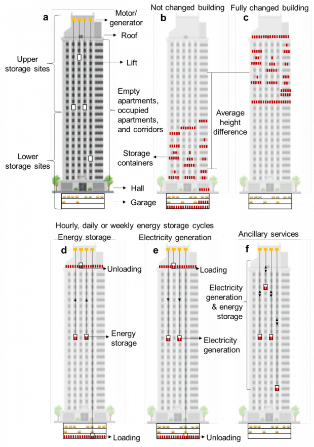 Sonnen- und Windenergie gelten als wichtige Säulen der Energiewende. Damit diese Energieformen aber langfristig nutzbar sind, müssen ihre wetterbedingten Produktionsschwankungen ausgeglichen werden. Dafür braucht es Energiespeicher. Eine clevere und originelle Idee sieht vor, die Fahrstuhlsysteme von Hochhäusern zu Energiespeichern umzufunktionieren, indem sie überschüssigen Strom wie ein Pumpspeicherwerk speichern. Weltweit betrachtet könnte sich dadurch eine Speicherkapazität zwischen 30 und 300 Gigawattstunden ergeben, rechneten Forscher:innen aus. Pumpspeicher speichern Stromüberschuss Die Aufgabe von Energiespeichern ist es, Überschüsse bei der Stromproduktion aus erneuerbaren Energien abzupuffern und die gespeicherte Energie wieder abzugeben, wenn die Nachfrage der Verbraucher das Angebot aus den erneuerbaren Energien übersteigt. Entsprechende Lösungsansätze gibt es einige. Zu ihnen gehören neben elektrochemischen Energien und thermischen Speichern auch Pumpspeicher, die Stromüberschüsse verwenden, um Wasser aus einem Reservoir in ein höher gelegenes Reservoir zu pumpen. Bei Bedarf kann das Gefälle zwischen den Reservoiren genutzt werden, um die gespeicherte Lageenergie mithilfe von Turbinen wieder zu Strom zu machen. Allerdings benötigen Pumpspeicherwerke viel Platz. Sie können zwar auch unterirdisch angelegt werden, sind aber generell eher für ländliche Gegenden geeignet. In Großstädten bietet sich eine andere Alternative an. Julian Hunt vom International Institute für Applied Systems (IASA) hat sich mit seinen Kolleg:innen ein cleveres Konzept überlegt, das Fahrstühle und Hochhausetagen als Energiespeicher nutzt. „Ich war schon immer fasziniert vom Prinzip der Lageenergie – der Stromerzeugung durch Höhenunterschiede wie beispielsweise durch Wasserkraft, Pumpspeicher, Auftrieb oder Schwerkraftspeicher„, so Hunt. Fahrstühle als Stromspeicher? Das von Hunt und seinem Team entwickelte Konzept hört auf den Namen Lift Energy Storage Technology (LEST) und nutzt die Tatsache, dass die meisten modernen Fahrstühle auf dem Weg nach unten Strom erzeugen. Die Energie der Fahrstühle beim Herabfahren wird mit speziellen Generatoren zurückgewonnen und zur Stromerzeugung genutzt. „Diese Permanentmagnet-Elektromotoren/Bremsen haben eine Effizienz von fast 92 Prozent„, so die Forscher. Vor allem beladene Fahrstühle setzen beim Herabfahren viel Energie frei. Das LEST-System basiert darauf, dass in Zeiten mit wenig Auslastung der Fahrstühle und Stromüberschuss diese genutzt werden können, um schwere Gewichte in Lager in den oberen Etagen von Hochhäusern zu transportieren. Je nach Fahrstuhl könnte ein solches Gewicht bis zu 1000 Kilogramm schwer sein. Denkbar wäre, Behälter mit nassem Sand oder Blei- beziehungsweise Betongewichte einzusetzen. Für den Transport der Gewichte wären autonom agierende Roboter zuständig. Wenn dann Strom benötigt wird, können die Gewichte mit dem Fahrstuhl in ein Lager im Keller oder den unteren Etagen des Gebäudes befördert werden. Im Zuge dieses Transports gewinnt das Bremssystem Strom aus der freiwerdenden Lageenergie zurück. Die so speicherbare Energiemenge variiert je nach den Gewichten und der Höhe der Gebäude. „Ein Gebäude mit 5.000 Gewichtscontainern und einer 50 Meter Höhendifferenz hat eine Energiespeicherkapazität von rund 545 Kilowattstunden„, so die Forscher:innen. Bild: Hunt et al. Relativ günstige Lösung Nach Angaben des Teams lohnt sich das System überall dort, wo es mehrere Hochhäuser mit einer Höhe von mindestens 5ß Meter gibt. Würde dieses System mit je 5000 Gewichtscontainern in jedem entsprechenden Hochhaus der Welt installiert werden, ergäbe sich eine Mindestkapazität von 30 Gigawattstunden. Mit mehr Gewichten ließen sich sogar 300 Gigawattstunden so speichern. Die Kosten für das System halten sich dabei in Grenzen. Die meisten Hochhäuser sind bereits mit Fahrstühlen ausgestattet, die beim Herabfahren Strom gewinnen. Es müssten also nur noch Gewichte, Lagerstätten sowie das autonome Verteilungssystem geschaffen werden. Das Team kam zu dem Schluss, dass das System bei einer mittleren Höhendifferenz von 100 Metern etwa 62 US-Dollar pro Kilowattstunde kosten würde. Die meisten Batteriespeicher sind teurer. System für Metropolen Allerdings funktioniert das System nur in Gebäuden, in denen ausreichend Möglichkeiten zur Lagerung der Gewichtscontainer zur Verfügung stehen. Außerdem muss die Statik des Gebäudes die Lagerung entsprechender Gewichte ermöglichen. Die Forscher:innen sehen in ihrem System dennoch einen sinnvollen Ansatz zur Zwischenspeicherung der Energie, die aus Sonne und Wind gewonnen wird. Besonders in Metropolen würde sich das System lohnen. „LEST kann als dezentrale urbane Energiespeicher-Lösung dienen, um Schwankungen von Wind- und Solarstrom und Bedarfsschwankungen auszugleichen„, so das Team. via International Institute for Applied Systems Analysis (IIASA) Teile den Artikel oder unterstütze uns mit einer Spende. Facebook Facebook Twitter Twitter WhatsApp WhatsApp Email E-Mail Newsletter