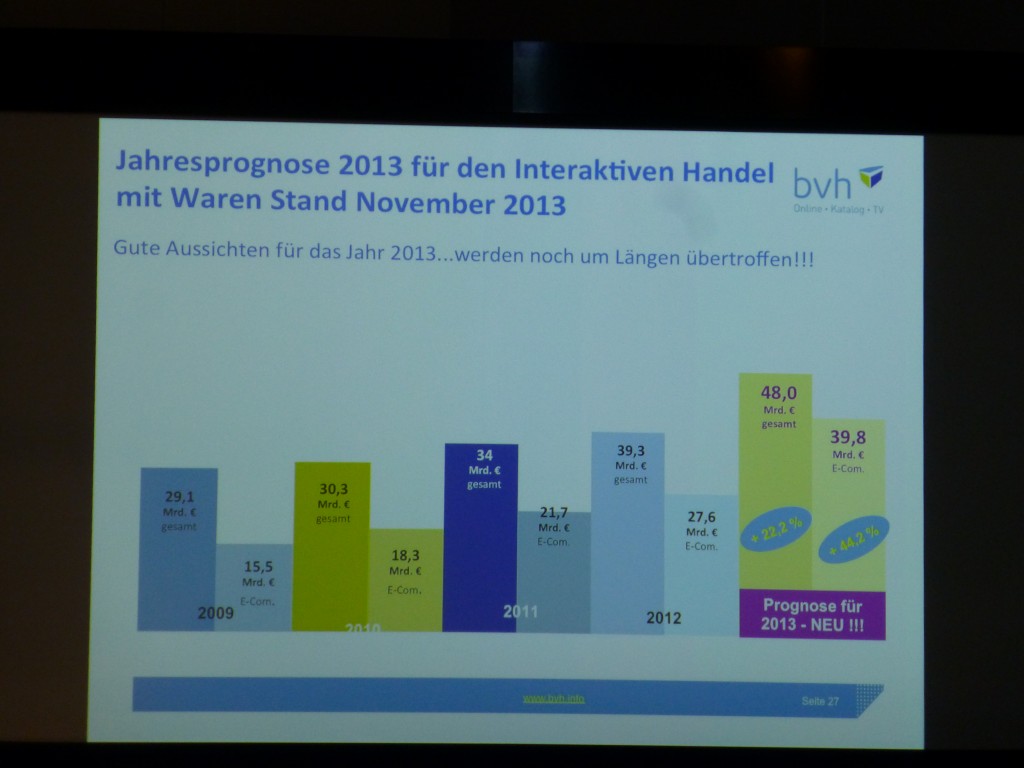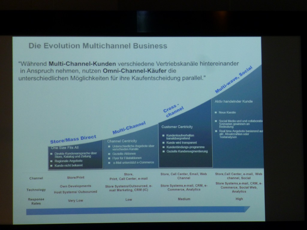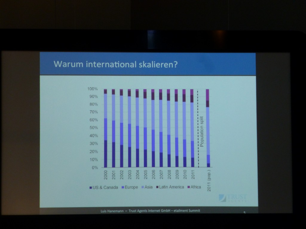 Die Ecommerce Trends für 2014 und die nächsten Entwicklungen im interaktiven Handel waren das Haupt-Thema beim Etailment Summit vom 6.-7. November 2013 in Berlin bei dem Top Speaker aus der Branche ihre Erfahrungen, Strategien und Maßnahmen verrieten, um im Online-Handel den Anschluss nicht zu verpassen. Dabei zeigte sich auch, dass E-Commerce immer stärker auch wieder in den Offline-Handel integriert wird. Doch auch der technologische Fortschritt geht weiter – oder wie es DHL Paket CEO Dr. Andrej Busch formulierte: „Unsere Generation ist dazu Verdammt alle Technologien abzuarbeiten, die wir auf Star Trek gesehen haben“ Multichannel, Omnichannel & Couch ist King BVH (Bundesverband des Deutschen Versandhandels) Präsident Thomas Lipke eröffnete die Konferenz und präsentierte einige interessante Zahlen zur Entwicklung im Ecommerce. Weitere Speaker waren u.A. Dr. Andrej Busch (CEO von DHL Paket), Luis Hanemann (Partner Trust Agents, vormals CMO Rocket Internet), Dietmar Dahmen (Xio / Adobe), Sebastian Grebasch (Zalandao), uvm. E-Commerce wächst stärker als erwartet Der E-Commerce Anteil im Deutschen Versandhandel stieg 2013 deutlich stärker als prognostiziert auf geschätzte 39,8 Mrd. Euro im Vergleich zu 27,6 Mrd. in 2012 und trug somit erheblich zum Gesamtumsatz der Versandhändler bei. Der Nicht-Online-Umsatz ging hingegen um ca. 1/3 zurück von 12,3 Mrd. in 2012 auf 8,2 Mrd. in 2013. Dieser Rückgang wurde jedoch durch den E-Commerce Umsatz mehr als ausgeglichen. Von Multi-Channel über Cross Channel zum Omni Channel Potentielle käufer nutzen in ihrem Kaufprozess mehrere Medien und Vertriebskanäle. Nur über 1 oder 2 Kanäle zu kommunizieren reicht mitunter nicht aus. Alle Kanäle wie Social Media, Offline, TV, Mobile, Online Stores, physische Geschäfte, etc. sollten verknüpft eingesetzt werden. Evolution im Multichannel Business Auf dem Sofa werden Kaufentscheidungen gefällt Eine gute Nachricht für TV Sender ist die Aussage, dass viele Kaufentscheidungen nach wie vor auf der Couch gefällt werden. Allerdings spielen hier auch Smartphone und Tablet eine Rolle, die parallel zum TV genutzt werden. Verschiedene Medien-Kanäle und ihre Eigenschaften Kein Medium hat einen exklusiven Zugang zum Kunden – und oft werden einzelne Medien parallel bzw. seriell genutzt. Die Chinesen kommen … und ziehen an uns vorbei Noch im Jahr 2000 machten Europäer, USA und Kanada fast 2/3 der Internetnutzer aus. Mittlerweile sind wir nur noch 1/3. China, Südamerika und sogar Afrika nehmen gewaltig an Bedeutung zu. Asien, Südamerika und Afrika dominieren die Internet-Welt Wichtig ist hier die Information, dass in diesen „neuen“ Regionen Mobile oft wichtiger ist als Desktop, da es in vielen Regionen kein Internet über Kabel sondern nur über Mobilfunkanbieter gibt. Auch das auf der Konferenz immer erwähnte Buzzword „Same Day Delivery“ gehört in Asien vielerorts bereits zum Standard. Während hierzulande DHL mit Paket.de eine hierzulande innovative Plattform für bessere Paketzustellungen geschaffen hat, so bietet das von Walmart zu mindestens 51% aufgekaufte Chinesische Unternehmen yhd.com (Yihaodian) bereits in unzähligen Städten 3 Stunden Lieferungen an. Dafür sorgt eine Armada aus Scooter Fahrern die auch die Bezahlabwicklung übernehmen. Während Rechnungskauf und Nachnahme bei Ecommerce Shops in Deutschland oft aus Risikogründen weggelassen werden gehört das Cash on Delivery in China eigentlich zum Standard und sorgt beiderseits für Vertrauen. 1.000 Geschäfte über Nacht mit virtuellen Produkt-Displays Yihaodian sorgte mit einer Aktion für aufsehen, wo sie über Nacht 1.000 virtuelle Geschäfte in ganz China eröffneten. Anstatt die Produkte direkt vorrätig zu haben werden lediglich die Produktbilder mit einem QR Code angezeigt. Der Kunde bestellt mit seiner App und bekommt sie in einem engen Radius innerhalb von 3 Stunden und in 250 km Umkreis innerhalb von 12 Stunden geliefert! Alleine 100 dieser Stores wurden auf Parkplätzen, in Ubahnen, etc. in Peking platziert. Doch auch ohne einen Store kann man via einer Augmented Reality App jederseit mit seinem Smartphone in einem der virtuellen Shops einkaufen. Mit dem Laden des Videos akzeptieren Sie die Datenschutzerklärung von YouTube.Mehr erfahren Video laden YouTube immer entsperren Chinesen werden selbst im Ausland tätig Während viele Händler hierzulande China nur als billiges Produktionsland oder höchstens noch als Absatzmarkt sehen übersehen viele die Expansion chinesischer Shops und Unternehmen in die ehemaligen Auftragsländer USA, Kanada, Deutschland, etc. Wie Torsten Waack van Wasen von der diligenz group New York und Dr. Dirk Seifert (Leiter internationale Forschungsgruppe zu E-Commerce, Fudan University Shanghai, China) zu Denken geben ist dieser Prozess bereits im Gange. Unternehmen wie der Online Retailer JD.com von denen hier noch nie jemand gehört hat sind mitten in den Vorbereitungen für die globale Expansion. Finanzielle Mitel sind vorhanden und die Chinesische Regierung subventioniert die Exportkosten. Dr. Seifert liefert hierzu eine Anekdote aus einem Gespräch mit Vertretern von JD.com: Seifert: Wie wollen Sie denn die Produkte nach Europa bekommen? Chinese: Die Chinesische Regierung hat einen Flughafen in Ungarn gekauft. Da senden wir alles hin und verteilen es dann. Die Transporte werden von der Regierung subventioniert. Wenn es soweit ist werben wir Sie ab. Wir wollen Deutsche Entwickler und Online Marketing Experten. Erfolgsfaktoren im E-Commerce: Preis, Zahlungsmethode, Auswahl, … Die Frage welche Erfolgsfaktoren im E-Commerce am vielversprechenden beantworteten die Sprechen arvato (Bertelsmann Tochter) und Plus.de mit folgendem Chart: Zahlungsmethoden entscheidend für Kunden Bei den Zahlungsmethoden ist der Klassiker Rechnung nach wie vor am beliebtesten beim Kunden. Gefolgt von der Kreditkarte. Interessant ist, dass sich Paypal schon auf Platz 3 vorschieben konnte. Rechnung als