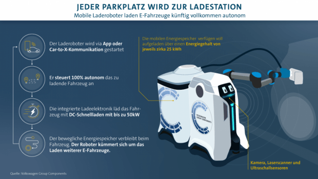 Volkswagen setzt so konsequent wie kein anderer deutscher Autobauer auf die Elektrifizierung des Straßenverkehrs. Mit dem VW ID.3 soll in naher Zukunft sogar ein Elektroauto für unter 30.000 Euro auf den Markt kommen. Zahlreiche Studien haben aber gezeigt, dass die Entscheidung für oder gegen ein Fahrzeug mit Elektromotor keineswegs nur vom Preis abhängt. Vielmehr verweisen viele potentielle Käufer auch auf die bisher nur mangelhaft ausgebaute Infrastruktur. Es ist daher nicht verwunderlich, dass Volkswagen auch in diesem Bereich viele Anstrengungen unternimmt. Ein Beispiel dafür: Der Konzern hat einen mobilen und autonomen Laderoboter entwickelt, der beispielsweise in Parkhäusern stets für volle Batterien in den parkenden Autos sorgen könnte. Bild: Volkswagen Der Roboter wird per App zum Einsatz gerufen Grundsätzlich besteht die Idee dahinter zunächst einmal darin, nicht jeden einzelnen Parkplatz mit einer Ladestation auszustatten. Dies soll die Kosten niedrig halten. Stattdessen werden einzelne Batterien zentral an einem Ort aufgeladen, wie dies beispielsweise auch mit den Akkus von Gabelstaplern in vielen Lagerhallen passiert. Dort allerdings muss der Fahrer den Akku im Bedarfsfall von Hand austauschen. Dies ist bei den deutlich schwereren Batterien von Elektroautos keine Option. Stattdessen hat sich Volkswagen eine clevere Alternative einfallen lassen. So kann der Fahrer die Aufladung des Fahrzeugs per App in die Wege leiten. Anschließend macht sich ein autonomer Roboter auf den Weg, schnappt sich eine der Batterien und fährt diese zum Zielauto. Mit dem Laden des Videos akzeptieren Sie die Datenschutzerklärung von YouTube.Mehr erfahren Video laden YouTube immer entsperren Das System ist unter anderem für Parkhäuser gedacht Dort verbindet er dann per Stecker den geladenen Akku mit dem Fahrzeug und startet so den Ladevorgang. Nach dessen Abschluss verläuft der Vorgang dann in umgekehrter Reihenfolge: Der Roboter zieht den Stecker, bringt die Batterie zurück zur Ladestation und schließt diese dort wieder an. Im besten Fall muss der Fahrer des Autos also nicht mehr machen, als einen Knopf auf dem Smartphone zu drücken. Grundsätzlich ist das System daher gut geeignet, um auf Flächen mit vielen Stellplätzen auf wenig Raum eine flächendeckende Versorgung zu gewährleisten. Noch ist aber unklar, wann die ersten Kunden den Service tatsächlich nutzen können werden. Denn bisher hat Volkswagen noch keinen Termin für eine erste öffentliche Installation bekannt gegeben. Via: Electrek Teile den Artikel oder unterstütze uns mit einer Spende. Facebook Facebook Twitter Twitter WhatsApp WhatsApp Email E-Mail Newsletter