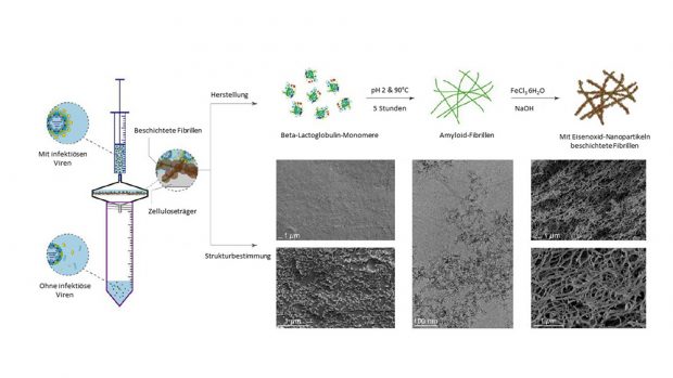 Die meisten Viren verbreiten sich entweder über Flüssigkeitstropfen oder direkten Kontakt. Speziell in kontaminiertem Wasser können Erreger über eine lange Zeit infektiös bleiben. Sie aus Wasser zu entfernen, war bisher nur unter Einsatz von aufwändigen und umweltbelastenden Techniken möglich. Forscher haben nun einen Virenfilter entwickelt, der nicht nur effektiv ist, sondern auch einfach hergestellt werden kann. Bild: Palika A et al, Nature Nanotechnology, 2021 Kombinationsfilter reinigt Wasser Die Entfernung gefährlicher Viren wie etwa dem Coronavirus SARS-CoV-2, Ifnfluenza oder Rotaviren aus Wasser ist oft nur mit Verfahren wie Umkehrosmose oder mit nanosilberhaltigen Filtern möglich. Ein Team rund um Archana Palika von der Eidgenössischen Technischen Hochschule Zürich (ETH) haben nun einen neuartigen Filter entwickelt, der auf einem Netz aus Molkeproteinen und Eisen-Nanopartikeln basiert. Dabei handelt es sich um biokompatible Materialien. Der Filter besteht aus denaturierten Molkeproteinen, die sich unter dem Einfluss von Säure und durch Erhitzen auf etwa 90 Grad zu feinen Amyloidfibrillen zusammenschließen. Anschließend kommt hydratisiertes Eisenchlorid hinzu. Außerdem wird der pH-Wert der Lösung durch Natronlauge wieder erhöht. Das Eisenchlorid wandelt sich dadurch in Eisenhydroxid-Nanopartikel um, die sich an die aus den Molkeproteinen entstandenen Amyloidfasern anlagen. Diese Nanopartikel sind positiv geladen und können die in der Regel negativ geladenen Viren anziehen. Das funktioniert sowohl mit umhüllten Viren wie Influenzaviren oder auch SARS-CoV-2, aber auch mit unbehüllten Erregern wie Rota- oder Enteroviren. Mit Molkeproteinen gegen Viren In Tests mit verschiedenen Viren – sowohl mit als auch ohne Hülle – konnten die Forscher zeigen, wie gut ihr Filter funktioniert. Sie kontaminierten Wasser mit dem unter anderem mit dem Coronavirus SARS-CoV-2, dem Influenzavirus H1N1 sowie mehreren Bakteriophagen. Die Belastung lag dabei bei etwa einer Million infektiösen Einheiten pro Milliliter. In den Tests sank nach der Passage durch die Filtermembran die Virenkonzentration in allen Proben unter die Nachweisgrenze. „Die Membran reduzierte damit das infektiöse Potenzial um mehr als sechs Größenordnungen„, erläutern die Forscher. In weiteren Tests fanden sie heraus, dass die Viren nicht nur gefiltert, sondern auch durch die Eisen-Nanopartikel inaktiviert wurden. Durch die Kombination von Esen-Hydroxid-Nanopartikeln mit den Molkeproteinen ist die Filtermembran also besonders effektiv. Die Membran wurde von den Wissenschaftlern zwar primär als Filter für Kläranlagen und in der Trinkwasseraufbereitung konzipiert, aber ein Einsatz in Luftfiltereinheiten oder gar Masken sei auch denkbar. „Wir sind uns bewusst, dass das neue Coronavirus überwiegend über Tröpfchen und Aerosole übertragen wird. Doch selbst dabei muss es stets von Wasser umgeben sein. Dass wir es sehr effizient auch aus dem Wasser entfernen können, unterstreicht die breite Anwendbarkeit unserer Membran eindrücklich„, so Seniorautor Raffaele Mezzenga von der ETH Zürich. Günstig in der Herstellung Die Membran ist außerdem einfach und kostengünstig in der Herstellung. Durch den Einsatz von biokompatiblen Materialien weist sie eine hervorragende Umweltbilanz auf. Sie lässt sich außerdem unter minimalen Energieaufwand produzieren und benötigt keinen Strom in der Anwendung. Gerade in wärmeren Ländern könnte der Filter zum Einsatz kommen, um gefährliche Virusinfektionen zu unterbinden. In den Entwicklungs- und Schwellenländern sterben Jahr für Jahr etwa 500.000 Menschen an Infektionen mit Enteroviren. Die Opfer sind oft Kleinkinder. Enteroviren sind sehr zäh und säurebeständig, sie können im Wasser sehr lange überleben. Die Filter könnten aber auch im Rahmen der Corona-Epidemie Infektionen verhindern. via ETH Zürich Teile den Artikel oder unterstütze uns mit einer Spende. Facebook Facebook Twitter Twitter WhatsApp WhatsApp Email E-Mail Newsletter