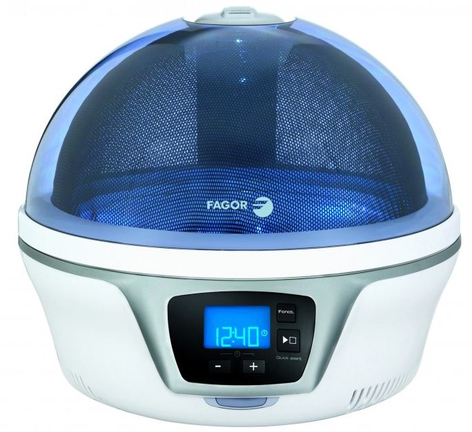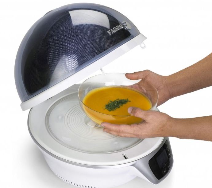 Ein Ufo vom Mars? Nein, eine Mikrowelle! Der fünft größte Haushaltswarenhersteller Europas, Fagor, hat sich mit der freistehenden Spoutnik Mikrowelle sicherlich alle Blicke gesichert. Spoutnik ist rund und vor allem wegen seiner farbigen Kuppel schön anzuschauen. Läuft die eingestellte Zeit ab, verändert sich die Farbe von Rot nach Blau. Garantierter Hingucker für die Küche! Einfach zu putzen Spoutnik kommt in den drei spacig klingenden Farben Blue Odyssey, Ultraviolet und Green Flash. Da die Kuppel transparent ist, kann man beispielsweise seinen Teller Eintopf während des Erhitzungsvorgang beobachten und so leichter entscheiden, wann ein Gericht genügend heiß ist. Schaltet man die Mikrowelle ein, wird die Drehscheibe rot, ist die Zeit abgelaufen, wird sie blau. Da man die Kuppel bis zu 65 Grad öffnen kann, ist auch das Putzen erheblich leichter als bei einer normalen Mikrowelle. Quickstartknopf Insgesamt sind vier Optionen wählbar: Erwärmen, Hohe Temperatur, Niedrige Temperatur und Auftauen. Zudem steht dem Nutzer noch der Quickstartknopf zur Verfügung. Hier stellt man einfach die Zeit ein und schaltet ein. Die Maße der Spoutnik Mikrowelle sind ca. 37 x 33 x 43 cm. Aufgrund der Kuppel können auch hohe Dinge problemlos erwärmt werden. Erhältlich ist das futuristische Küchengerät für 222 Euro. Promovideo der Spoutnik Mikrowelle Mit dem Laden des Videos akzeptieren Sie die Datenschutzerklärung von YouTube.Mehr erfahren Video laden YouTube immer entsperren Quelle Teile den Artikel oder unterstütze uns mit einer Spende. Facebook Facebook Twitter Twitter WhatsApp WhatsApp Email E-Mail Newsletter