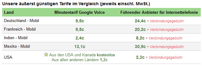 Wer sich aktuell in seinem Gmail Account einloggt bekommt eine Nachricht angezeigt, man solle sich doch für Google Voice freischalten. Einen dienst bei dem man mit seiner eigenen Telefonnummer über das Internet Festnetz- und Mobiltelefone anrufen kann. Google wird somit zu einer direkten Konkurenz für Skype, welches ja erst vor einigen Monaten von Microsoft aufgekauft wurde. Bereits im März 2009 wurde der Service für ausgewählte Kunden in den USA eingeführt (wir haben berichtet), es hat nun aber doch seine Zeit gekostet, bis der Dienst auch in Europa verfügbar wurde. Als User erhält man bei Google Voice über Gmail eine eigene Telefonnummer über die man auch Nachrichten empfangen kann wie bei einem Anrufbeantworter. Die Tarife für Google Voice sind zwar günstiger als bei den meisten Telefonanbietern, aber dennoch deutlich teurer als wenn man direkt online miteinander telefoniert. Ausgewählte Mobilfunk-Tarive bei Google Voice Anrufe ins Festnetz kosten dagegen meist zwischen 2 und 4 Cent, je nach Land. Anrufen kann man entweder ganz normal über die Nummernwahl oder durch klicken auf einen seiner Kontakte im Gmail-Chat. Mehr Infos und Tarife für weitere Länder gibt es auf der Google Voice Seite. Hier gibt es die Skype Tarife zum Vergleichen. Teile den Artikel oder unterstütze uns mit einer Spende. Facebook Facebook Twitter Twitter WhatsApp WhatsApp Email E-Mail Newsletter
