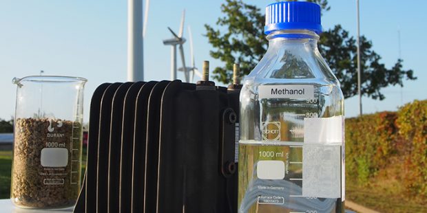 Flugzeuge, Schiffe, Lokomotiven auf nicht-elektrifizierten Strecken und schwere Lkw sind ohne Verbrennungsmotor kaum denkbar. Würden sie Treibstoffe tanken, bei deren Verbrennung nur so viel Kohlendioxid entweicht, wie bei deren Herstellung verbraucht worden ist, führen sie nahezu umweltneutral. Als Ausgangsmaterial könnte man beispielsweise Biomasse verwenden. Wenn sie unter Luftabschluss erhitzt wird, entsteht ein Gemisch aus Wasserstoff und Kohlenmonoxid, sogenanntes Synthesegas, das zusätzlich Kohlendioxid enthält. Aus Synthesegas lässt sich Methanol herstellen, ein Alkohol, der in entsprechend umgerüsteten Motoren direkt verbrannt oder in gängige Treibstoffe wie Benzin, Diesel und Kerosin umgewandelt werden. Die Ausbeute ist relativ gering, weil das Kohlendioxid übrig bleibt und die Atmosphäre belastet. Bild: DTU Zusätzlicher Wasserstoff aus Überschussstrom Das kann man ändern, sagten sich Forscher um Peter Vang Hendriksen, Professor an der dänischen Technischen Universität Dänemark (DTU) in Lyngby. Dazu ist zusätzlicher Wasserstoff nötig. Den gewinnen sie in einem Hochtemperatur-Elektrolyseur, der seine elektrische Energie aus Windstrom bezieht, der gerade keine Abnehmer findet. Heute müssen bei starkem Windaufkommen vorübergehend ganze Windparks abgeschaltet werden. Wenn dieser Strom zuverlässig genutzt werden kann profitiert die Umwelt, weil weniger fossile Treibstoffe verbrannt werden müssen. Abwärme aus dem Elektrolyseur wird weiter genutzt Die Kombination beider Techniken an einem Ort verbessert nicht nur die Ausbeute, sie erhöht auch den Wirkungsgrad. Die Elektrolyse findet bei Temperaturen von einigen 100 Grad Celsius statt. Es handelt sich um Abwärme, die eine sinnvolle und umweltverträgliche Verwertung sucht. Die findet sie in der Anlage zur Umwandlung von Biomasse in Synthesegas, geht also nicht verloren. Einen zweiten Weg, Methanol herzustellen, geht Professor Philip L. Fosbøl, DTU-Professor für Chemieingenieurswesen. Er wandelt Biogas, das aus Biomasse durch Vergärung gewonnen wird, in diesen Alkohol um. Gemeinsam mit der Industrie baut die DTU jetzt eine Demonstrationsanlage, die täglich 240 Kubikmeter Biogas produziert. Sie wird in einem Normcontainer untergebracht. Die Anlage, die das Gas in Methanol umwandelt, soll später hinzugefügt werden. via DTU 1, DTU 2 Teile den Artikel oder unterstütze uns mit einer Spende. Facebook Facebook Twitter Twitter WhatsApp WhatsApp Email E-Mail Newsletter