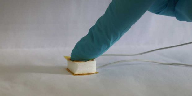 Holz hat, was kaum jemand weiß, piezoelektrische Eigenschaften. Wenn man es zusammendrückt, entsteht eine elektrische Spannung, wie beim Feuerzeug, das beim Druck auf den Auslöser einen Funken erzeugt. Diese Spannung ist jedoch so klein, dass sie kaum messbar ist. Ingo Burgert, Professor an der Eidgenössischen Technischen Hochschule Zürich (ETZ) und der dem ETZ-Materialforschungsinstitut Empa, und sein Doktorand Jianguo Sun wollten sich damit nicht zufriedengeben und begannen nach Wegen zu suchen, wie man den Effekt verstärken kann. Ziel war es, Trittflächen in Generatoren zur Stromerzeugung herzustellen, zumindest aber umweltverträgliche Drucksensoren möglich zu machen. Bild: ACS Nano / Empa Aus Balsa wird ein weißer Holzschwamm Wenn man Lignin, das den Holzfasern Stabilität verleiht, sodass Bäume eine Höhe von Dutzenden Metern erreichen, aus dem Holz entfernt wird es verformbar. Gleichzeitig verstärkt sich der piezoelektrische Effekt. Diese Delignifizierung gelingt in einer Mischung aus Wasserstoffperoxid und Essigsäure. Sie wäscht das Lignin heraus. Übrig bleibt ein Gerüst aus Zelluloseschichten. „Wir machen uns die hierarchische Struktur des Holzes zunutze, ohne sie, wie etwa bei der Papierherstellung, zuerst ganz aufzulösen und die Fasern anschließend wieder verbinden zu müssen“, erklärt Burgert. Aus einem Stück Balsaholz wird so ein weißer Holzschwamm, der aus übereinanderliegenden, dünnen Zelluloseschichten besteht. Diese lassen sich einfach zusammenpressen und nehmen danach wieder in ihre ursprüngliche Form an. „Der Holzschwamm erzeugt eine 85 Mal höhere elektrische Spannung im Vergleich zu nativem Holz“, sagt Sun. Bei jeder Belastung entsteht eine kleine Spannung Das Team unterzog einen Testwürfel mit einer Kantenlänge von etwa 1,5 Zentimetern rund 600 Belastungszyklen. Bei jeder Belastung maßen die Forscher eine Spannung von 0,63 Volt. Das reicht für einen Drucksensor aus. Werden 30 solcher Holzklötzchen miteinander verbunden und gleichmäßig mit dem Körpergewicht eines Erwachsenen belastet, fließt kurzzeitig so viel Strom, dass ein einfaches LCD-Display aufleuchtet. Wenn der so erzeugte Strom in einer Batterie gesammelt wird, lässt er sich nutzen, etwa um Sensoren mit Strom zu versorgen, die für das Internet der Dinge gebraucht werden. Würden die Holzklötzchen in stark frequentierte Fußböden integriert, hätte man eine zusätzliche umweltverträgliche Stromquelle. via ETH Zürich Teile den Artikel oder unterstütze uns mit einer Spende. Facebook Facebook Twitter Twitter WhatsApp WhatsApp Email E-Mail Newsletter