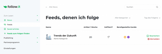 Newsletter-Abonnenten von Trends der Zukunft haben es vermutlich schon mitbekommen: Wir sind jüngst vom Google Feedburner zu follow.it gewechselt. Wenn ihr künftig Mails von follow.it erhaltet, dann bitte nicht wundern. Auch nicht, wenn ihr innerhalb der Mail darum gebeten werdet euer Okay für den Service noch einmal zu geben. Das hat alles seine Richtigkeit. Bestätigung des neuen Newsletter-Anbieters hat seine Richtigkeit Links Hier gelangt ihr zu unserem Newsletter Link direkt zum Abonnement Da sich der Trends der Zukunft Newsletter nach wie vor großer Beliebtheit erfreut, haben wir diesen neben den Social-Network-Icons in jedem Beitrag platziert. So kann auch der Newsletter mit nur einem Klick abonniert werden. Follow.it selbst bietet zudem einige Funktionen an. So könnt ihr beispielsweise mehrere Newsletter übersichtlich verwalten und auch entsprechend filtern. In Zukunft werden noch weitere Funktionen folgen. Wenn ihr Trends der Zukunft abonniert habt, bekommt ihr täglich eine Zusammenfassung der Nachrichten in euer Mailpostfach. Checkt bitte Mal, ob ihr den Newsletter auch erhaltet. Sollte dieser trotz Abonnement nicht eintreffen, überprüft bitte euren Spam-Ordner. Bei mir landeten die Newsletter vom Google Feedburner bei Web.de oftmals auch in diesem. Mit nur einem Klick auf das orangene Icon könnt ihr den Trendsderzukunft.de-Newsletter abonnieren. Das Icon befindet sich jeweils oben und unten auf der Artikelseite. Wer möchte kann gern ein Feedback dalassen. Für Verbesserungsvorschläge sind wir immer dankbar. Wir wünschen euch nach wie vor viel Spaß mit Trends der Zukunft und wollen noch einmal Danke sagen für euren großartigen, täglichen Support. Zudem möchten wir auch nocheinmal gesondert großen Dank an unsere Steady-Unterstützer aussprechen. Und aufgrund des jünsgten „Ereignisses“ auch dir Martin H. ein ganz dickes Dankeschön. Top! Vielen Dank Euer Trends-Team Yvonne, Katharina, Sven, Micha, Alex, Max, Wolf und Daniel. Teile den Artikel oder unterstütze uns mit einer Spende. Facebook Facebook Twitter Twitter WhatsApp WhatsApp Email E-Mail Newsletter