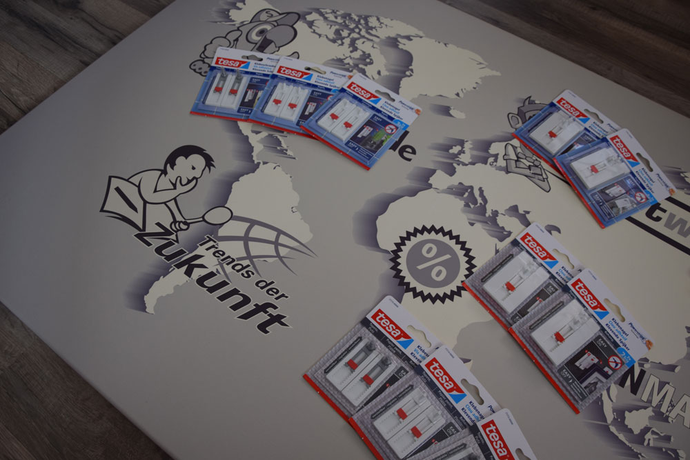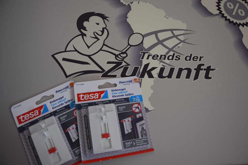 Kein Bohren, kein Schrauben, kein Messen und sonstige Vorwände, die das Aufhängen des neu erworbenen Bildes künstlich in die Länge ziehen. Die neuen tesa Klebenägel stellen eine gute Ergänzung zu Schrauben und Nägel dar. Wer keine Löcher in die Wand bohren und den Untergrund entsprechend schützen möchte, für den dürften die neuen Klebenägel eine echte Alternative darstellen. Wir haben uns die kleinen kräftigen Helferlein einmal angeschaut und für euch getestet. Die Installation und das Ergebnis Schon lange haben wir die Installation unseres „Weltbildes“ vor uns her geschoben. Nun konnten wir, dank tesa, genug Motivation finden, um Nägel mit Köpfen oder besser gesagt Klebenägel mit verstellbaren Haken zu machen. Das Bild ist mit 1,2 Metern Breite und 1 Meter Höhe recht groß und wiegt knapp zwei Kilogramm. Unsere Wahl fiel daher auf die 2×2 Kilogramm Klebenägel. Als Untergrund fungiert Spritzputz. Nachdem wir eine passende Stelle im Büro gefunden haben, entschieden wir uns für die verstellbaren Klebenägel für Tapeten und Putz, die insgesamt vier Kilogramm tragen sollen können. Vorteile Kein Werkzeug nötig Hammer oder Bohrer bleiben im Koffer Untergrund bleibt frei von Schäden Keine Löcher in der Wand Im Untergrund befindliche Kabel und Rohre bleiben heil Kein Lärm und Dreck Man kann zunächst ausprobieren, wo das Bild an der Wand am besten gefällt, ohne den Untergrund zu beschädigen Rückstandslos wieder ablösbar 1. Reinigung des Untergrundes und Andrücken der Klebestreifen und Nägel Bevor die Trägerstripes angebracht werden, haben wir die Stellen jeweils entsprechend gesäubert. Das ist sehr wichtig, um auch die volle Klebekraft herauskitzeln zu können. Oftmals wird der Reinigungsschritt aufgrund der großen Vorfreude vergessen. Wir empfehlen parallel zur Anwendung auch das entsprechende Videotutorial von tesa (unten eingeblendet) laufen zu lassen oder zumindest im Vorab kurz zu überfliegen. Nun gilt es die Klebestreifen richtig anzubringen. Hier kann man nicht viel verkehrt machen. Wichtig ist diese Anleitungs-konform festzudrücken. Jeweils fünf Sekunden pro Stelle. Zwei Streifen werden von der Trägerfolie entnommen und an die Wand geklebt. Die Klebestreifen bieten das Bindeglied zwischen Wand und den anschließend darauf angebrachten Nägeln. Diese werden ebenfalls angeklebt und fünf Sekunden angedrückt. Beachtet dabei, dass ihr den Klebenagel jeweils oben bündig anbringt. Die beiden Rechtecke unten sind für das einfache und rückstandslose Abziehen der Nägel da und haben durchaus auch einen wichtigen Nutzen. Nun wird der zweite Nagel nach der gleichen Vorgehensweise angebracht. Achtet bitte darauf, dass ihr einigermaßen gerade seid, das Feintuning kann dann per verstellbarem Nagel durchgeführt werden. Der Spielraum ist eigentlich großzügig genug, um am Ende auch stets ein gerades Ergebnis zu erhalten. Den Haken könnt ihr mittels des roten Schalters verstellen, der Schalter fungiert sozusagen als Lock on/off-Schalter. Schalter hoch, Haken in der Höhe nach unten verstellen und die Position dann wieder mittels Schalter nach unten fixieren. Das funktioniert ganz einfach und intuitiv. 2. Bild aufhängen und fertig Nachdem die Nägel ausgerichtet sind, kann das Bild, das Regal – oder was auch immer befestigt werden soll- angebracht werden. Nun heißt es Daumen drücken und schauen, wie lange das Ganze hält. Wir hoffen lange. Unser Haltetest ist vorgestern gestartet. Sobald das Bild abstürzt, wird es ein Update geben. Bisher halten die tesa Klebenägel, was der Hersteller verspricht. Rückstandsloses Entfernen Natürlich haben wir uns bei unserem Test auch verklebt und mussten nochmal korrigieren. Dazu mussten die Klebenägel zusammen mit dem Klebestreifen noch einmal von der Spritzputz-Wand entfernt werden. Wie im Video oben zu sehen ist, funktioniert das ganz einfach, indem an einem der unteren Kästchen gezogen wird. Die Klebestreifen gingen einfach ab und rissen auch keinen Putz heraus. Das funktioniert also ebenfalls sehr gut und war uns auch sehr wichtig. Tesa kann hier super auf den Erfahrungen mit den Powerstrips aufbauen. Videos Mit dem Laden des Videos akzeptieren Sie die Datenschutzerklärung von YouTube.Mehr erfahren Video laden YouTube immer entsperren Mit dem Laden des Videos akzeptieren Sie die Datenschutzerklärung von YouTube.Mehr erfahren Video laden YouTube immer entsperren Tesa Klebenägel Galerie Verschiedene Einsatzbereiche Tesa Klebenägel sind für verschiedene Untergründe verfügbar. Der Wandgestaltung in Form von Aufhängern oder auch Dekoration (bspw. gerahmten Bildern, Gallery Wall) werden damit keine Grenzen gesetzt. Als Wandoberflächen können sich Tapete, Putz, Backstein, Fliesen oder Glas qualifizieren. Halterungen für das Handy, für Kopfhörer oder für leichte Musikanlagen sind ebenfalls weitere Anwendungsbeispiele. Alles, was nicht schwerer ist als 1,2,3 oder 4 Kilogramm, kann somit an der Wand befestigt werden. Weitere Inspirationen liefert tesa auch auf der DIY-Seite. Fazit Die Klebenägel von tesa bieten eine sehr bequeme Lösung zum herkömmlichen Bohren oder Anbringen von Nägeln in die Wand an. Nach wenigen Minuten hängt das Bild, die Leinwand und Co. Man erspart sich das Kramen nach Werkzeug, macht keinen Lärm und Dreck, zudem wird der Untergrund nicht beschädigt. Vor allem für Mieter ist das eine elegante Lösung, die zuletzt beim Auszug aus der Wohnung auch eine Menge Arbeit spart. Mich grault es schon jetzt davor die ganzen Dübel wieder zu entfernen und die Löcher zuzuspachteln und anschließend dann mit Wandfarbe zu tuschieren. Mit den neuen tesa Klebenägeln wird das Ganze obsolet. Wer sich an die Anleitung hält, den Untergrund vorher ordentlich reinigt und die Klebestreifen, samt Nägel, gut andrückt, der dürfte auch auf solide Halteeigenschaften vertrauen können. Insgesamt bieten die Klebenägel eine gute Alternative zu Schrauben und Nägel. Je nach vorherrschendem Unter