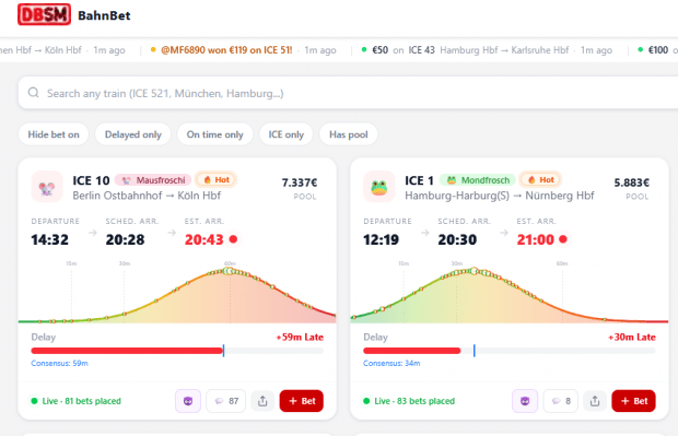 Der Deutschen Bahn eilt ihr Ruf voraus; Witze über ihre Unpünktlichkeit gibt es bereits zuhauf. Bestimmt hat auch schon der eine oder andere Scherzbold auf Zugverspätungen gewettet, schließlich kommen die so zuverlässig, wie man sich die Bahn wünscht. Der Wiener Caio van Caarven ist einer von denen, der seine Frustration lieber in Humor als in Wut umsetzt. Er war schon öfter mit unserer Deutschen Bahn unterwegs und betreibt einen gut besuchten Instagram-Kanal, mit dem er nun sein nagelneues Wettportal bahn.bet bewirbt. Bahn.bet: Wettportal auf Verspätungen / Foto: Screenshot von bahn.bet Mir Spielgeld auf echte Verspätungen wetten 2 Monate bastelte van Caarven an der neuen Plattform, teilweise mit 80 Wochenstunden. Nun ist das Werk vollbracht und jeder, der möchte, kann dort auf echte Verspätungen wetten. Echtes Geld ist allerdings nicht zugelassen. Wer sich registriert, erhält 1.000 »Dollar« Spielgeld, die er als Wetteinsatz verprassen oder gründlich vermehren kann. Der Organisator gab bereits auf Instagram bekannt, innerhalb von 24 Stunden rund 150.000 Wettbegeisterte aktiviert zu haben. Auf dem Dashboard sind die laufenden Wetten zu sehen, ebenso wie die zugehörigen Nutzerkommentare. Geht der Zug endlich durchs Ziel, verteilt der Algorithmus automatisch die Erlöse. Derjenige, der die tatsächliche Verspätung am genauesten trifft, erhält die meisten Spieldollars – aber auch die Plätze danach werden nach einer festen Quote bedacht. Investoren sehen reale Geldquelle im Portal Angeblich hat van Caarven für sein Projekt bereits Investorenanfragen erhalten, die darin eine echte Geldquelle sehen. Auch er selbst glaubt daran, dass sich aus bahn.bet noch mehr machen lässt. Der Bayerische Rundfunk fragte außerdem schon bei der Bahn selbst an, wie ihr das Projekt gefällt. Eine Antwort blieb bislang aus, aber van Caarven konnte sich einen altklugen Kommentar nicht verkneifen: »Ich weiß nicht, wie pünktlich der Humor bei der Deutschen Bahn eigentlich ankommt.« Bekannt ist der gebürtige Brasilianer auf Instagram wegen seiner Comedy-Posts und satirischen Kochprojekte. @caarven folgen aktuell 214.000 Fans. Quelle: futurezone.at Teile den Artikel oder unterstütze uns mit einer Spende. Facebook Facebook Twitter Twitter WhatsApp WhatsApp Email E-Mail Newsletter