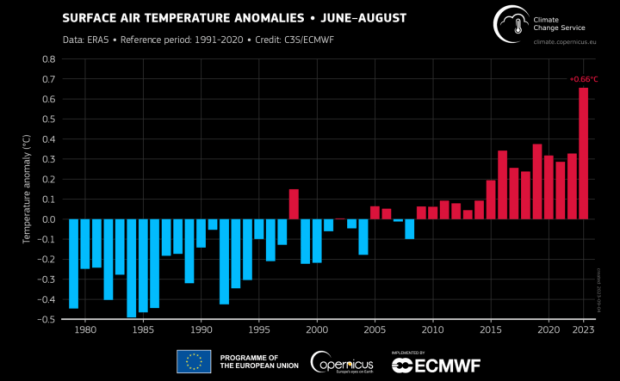 Der Sommer 2023 ist global betrachtet der mit Abstand wärmste seit die Menschheit begonnen hat, Klimaaufzeichnungen anzufertigen. Luft und Ozeane waren in der Zeit von Juni bis August noch nie so aufgeheizt. Das geht aus Daten der Weltwetterorganisation WMO sowie des europäischen Klimadienstes Copernicus hervor. Das Antarktis Meereis ist zudem auf einem neuen Tiefstand. Foto: Cold Sun, Mark Vegas, Flickr, CC BY-SA 2.0 Ein Rekordsommer Das Jahr 2023 ist in besonderer Art und Weise von Wetterextremen geprägt. Sei es Hitze, Stürme oder sintflutartige Regenfälle – all das trat diesen Sommer verstärkt auf. Bereits der Winter war deutlich zu warm, auch hierzulande. Im Frühsommer folgten dann die ersten Hitzewellen, von denen vor allem der Mittelmeerraum und Teile Asiens sowie Nordamerikas betroffen waren. Im Juli kamen dann marine Hitzewellen hinzu, die vor allem im Nordatlantik und im Mittelmeer auftraten. Daten der World Meteorological Organization (WMO) und des europäischen Copernicus-Klimadienstes bestätigen nun, dass es sich beim Sommer 2023 um einen Extremsommer handelt. Von Juni bis August 2023 traten die bisher höchsten Durchschnittstemperaturen seit Beginn der Klimaaufzeichnungen auf. Drei Monate in Folge wurden neue Rekordwerte erreicht. So war der August 2023 etwa 1,5 Grad wärmer als der für diesen Monat typische Durchschnitt in der Zeit zwischen 1850 und 1900. „Die Nordhalbkugel hat gerade einen Sommer der Extreme hinter sich – mit wiederholten Hitzewellen, die verheerende Waldbrände anheizten, der Gesundheit schadeten, den Alltag störten und bleibende Folgen in der Umwelt hinterließen„, erklärt Petteri Taalas, Generaldirektor der WMO. Überdurchschnittlich hohe Temperaturen traten auch in Teilen Südamerikas, in der Antarktis und Australien auf. Die schwelende Hitze, die die Erde diese Saison erlebte, veranlasste Taalas dazu, vom Beginn des „Klima-Kollaps“ zu sprechen. Grafik: WMO Wärmerekorde auch im Wasser Nicht nur an Land, sondern auch in den Ozeanen traten Rekordwerte auf. Die mittleren Oberflächentemperaturen der Meere lag im August bei 20,98 Grad. So hoch war sie noch nie. „Bemerkenswert ist dabei, dass dies geschieht, bevor wir die vollen Auswirkungen des aktuellen El Niño zu spüren bekommen„, so Taalas. Dieses Klimaphänomen ist für gewöhnlich für die Erwärmung der Ozeane verantwortlich und erreicht seinen stärksten Effekt erst im zweiten Jahr. Und selbst 2016, als El-Niño einen neuen Rekord aufstellte, erreichten de Temperaturen der Meere nicht so hohe Werte. Und auch die Lufttemperaturen der ersten acht Monate diesen Jahres liegen bereits jetzt nur noch 0,01 Grad unter dem Wärmerekord von 2016. Es bestehen also gute Chancen, dass dieses Jahr ebenfalls das wärmste seit Beginn der Aufzeicnungen werden wird. Das Meereis geht zurück Auch im Meereis der Polargebiete zeigt sich, dass der Planet überhitzt ist. Das Eis im Meer der Antarktis blieb auf einem Rekordtiefstand für diese Jahreszeit – im August waren es flächenmäßig 12 Prozent weniger als der langjährige Durchschnittswert für den Monat. Besonders betroffen ist das nördliche Rossmeer sowie die antarktische Teile des Indischen und Atlantischen Ozeane. Im Bereich der Amundsen-Bellingshausensee gibt es derzeit etwas mehr Meereis als sonst. In der Arktis gibt es im Moment etwa zehn Prozent weniger Meereisfläche als es dem langjährigen Mittel für diese Zeit entspricht. Dies ist jedoch noch kein Rekordwert, da das Meereis im Nordpolargebiet 2012 noch stärker verdrängt wurde. Klimawandel in der Praxis Sowohl die WMO als auch Europas Klimadienst Copernicus sehen in diesen Extremen deutliche Signale des Klimawandels. „ Was wir hier beobachten, ist eine klare Konsequenz der Erwärmung des Klimasystems. Dafür sprechen nicht nur die neuen Extreme, sondern auch die Persistenz dieser rekordträchtigen Bedingungen und die Auswirkungen, die sie auf Menschen und den Planeten haben„, so Carlo Buentempo, der Leiter des Copernicus Klimadienstes. via WMO Teile den Artikel oder unterstütze uns mit einer Spende. Facebook Facebook Twitter Twitter WhatsApp WhatsApp Email E-Mail Newsletter