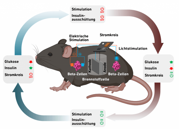 Medizinische Kleingeräte und Implantate werden bereits heute genutzt. Ein prominentes Beispiel sind Herzschrittmacher. Und regelmäßig werden weitere solcher Geräte neu entwickelt, die Menschen mit bestimmten Gesundheitsproblemen helfen sollen. Eine Herausforderung ist dabei die Energieversorgung. Forscher:innen haben nun ein cleveres System vorgestellt, das in Zukunft genutzt werden soll, um etwa Implantate mit Strom zu versorgen. Es handelt sich um eine Brennstoffzelle, die aus dem Blutzucker im Körper elektrische Energie gewinnt. Das Konzept wurde auch bereits im Mäuse-Modell getestet, befindet sich allerdings noch in einer frühen Entwicklungsphase. Bild: Fussenegger Lab / ETH Zürich Strom aus dem Zucker im Blut gewinnen Medizinische Kleingeräte und Implantate benötigen eine zuverlässige Energieversorgung, um ordnungsgemäß zu funktionieren. Im Regelfall kommen dabei Batterien oder Akkus zum Eisatz. Allerdings arbeiten Forscher:innen weltweit auch an alternativen Möglichkeiten der Energieversorgung. Ein möglicher Ansatzpunkt ist es etwa, die Bewegung des Körpers zur Energieerzeugung zu nutzen. Ein Team der Eidgenössischen Technischen Hochschule in Zürich (ETH) hat ein neuartiges System präsentiert, bei dem der Blutzucker zur Energiegewinnung eingesetzt wird. Die Glukose im Blut fungiert sozusagen als Treibstoff für den Körper. „So kamen wir auf die Idee, Überschuss an metabolischer Energie zu nutzen, um Strom für den Betrieb von biomedizinischen Geräten herzustellen„, erklärt Seniorautor Martin Fussenegger. Die Forscher:innen entwickelten daraufhin eine Brennstoffzelle, also ein Gerät, das zugeführten Brennstoff elektrochemisch in Strom umsetzen kann. Als Brennstoff wird in diesem speziellen Fall die Glukose im Körper verwendet. Für ihre Brennstoffzelle entwickelten die Wissenschaftler:innen eine spezielle Anode, die aus kupferbasierten Nanopartikeln besteht und die Glukose zur Stromgewinnung in Glukonsäure und ein Atom spaltet. Diese Protonen können dann verwendet werden, um einen Stromkreislauf in Gang zu setzen. Die Brennstoffzelle wird mit einem biologisch kompatiblen Algenprodukt namens Alginat ummantelt. Dieses saugt sich dann mit Körperflüssigkeit voll und lässt Glukose in die Funktionseinheit passieren. Der Prototyp der Zelle sieht aus wie ein kleiner Teebeutel und kann direkt unter die Haut transplantiert werden. Tests im Mäusemodell verliefen erfolgreich Die Funktionalität ihrer Entwicklung zeigten die Forscher:innen anhand einer Anwendung, die bereits in einem Mäusemodell mit Mäusen, die unter Diabetes Typ 1 leiden, getestet wurde. Es handelt sich dabei um speziell hergestellte Betazellen in Kapseln, die bei einer Stimulation durch Strom oder LED-Licht Insulin herstellen können. In einem weiteren Experiment mit Mäusen zeigte das Team, dass die dafür benötigte Energieversorgung von der Blutzucker-Brennstoffzelle übernommen werden kann. Wenn diese Brennstoffzelle einen Glukoseüberschuss registriert, springt die Stromproduktion an. Die dabei gewonnene elektrische Energie wird verwendet, um die Betazellen zu stimulieren, sodass diese Insulin produzieren und den Wirkstoff ins Blut abgeben. Das Insulin lässt den Blutzuckerspiegel absinken. Sobald ein bestimmter Schwellenwert erreicht ist, stoppt die Stromproduktion, sodass kein Insulin mehr produziert wird. Die Brennstoffzelle fungiert in diesem Anwendungsfall also nicht einfach nur als Stromversorgung, sondern überwacht nebenbei auch die Glukosewerte im Blut und reguliert die Insulinproduktion. „Das neue System reguliert den Insulinpegel und damit den Blutzuckerstand somit autonom und könnte künftig zur Diabetesbehandlung eingesetzt werden„, so Fussenegger. Grafik: Maity D, et al, Adv. Mater. 2023 / ETH Zürich Die Forscher:innen betonen allerdings auch, dass das Konzept sich trotz des erfolgreichen Tests im Mäusemodell noch in einer frühen Entwicklungsphase befindet. Fraglich ist unter anderem, inwieweit die Brennstoffzelle auch in anderen Anwendungsfällen zum Einsatz kommen kann, in denen eine kontinuierliche Versorgung eines Implantats mit Energie nötig ist. Die ETH sucht aktuell nach Industriepartnern, die Geld und Know-How zur Weiterentwicklung des Systems beitragen können. „Denn ein solches Gerät zur Marktreife zu bringen, übersteigt unsere finanziellen und personellen Mittel bei Weitem„, erklärt Fussenegger. via ETH Zürich Teile den Artikel oder unterstütze uns mit einer Spende. Facebook Facebook Twitter Twitter WhatsApp WhatsApp Email E-Mail Newsletter