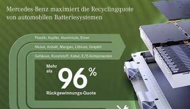 Dank eigener Fabrik: Mercedes erhöht die Recyclingquote von E-Auto-Akkus auf 96 Prozent Auch die deutschen Autobauer setzen immer stärker auf die Elektrifizierung ihrer Fahrzeuge. Mittel- bis langfristig entsteht dadurch eine doppelte Herausforderung. Zum einen müssen irgendwann immer mehr alte Akkus fachgerecht entsorgt werden. Zum anderen kann die Beschaffung der nötigen Rohstoffe für die Batterieproduktion zur Herausforderung werden. Der Nickel-Preis beispielsweise ist in Folge des Ukraine-Kriegs in ungeahnte Höhen geschossen. Beim Lithium wiederum … Den ganzen Artikel lesen Facebook Facebook Twitter Twitter WhatsApp WhatsApp Email E-Mail Newsletter