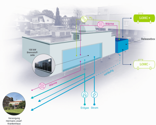 Das Hermann-Josef-Krankenhaus Erkelenz nahe Mönchengladbach bekommt eine Energiezentrale, wie sie die Welt noch nicht gesehen hat. Zehn von Bosch gelieferte Brennstoffzellen mit einer Leistung von insgesamt 100 Kilowatt liefern den gesamten Strom und sämtliche Wärme, die das 409-Betten-Hospital benötigt. Eigentlich sind damit alle Voraussetzungen für ein Null-Emissions-Haus geschaffen, doch grüner Wasserstoff zum Betrieb der Brennstoffzellen ist anfangs nicht zu haben. Als Notbehelf dient Erdgas, das auch den Gasmotor antreibt, der heute das Krankenhaus mit Strom und Wärme versorgt. Trotzdem sinken die Kohlenstoffdioxid-Emissionen bereits in diesem Stadium um 40 Prozent, weil die Festoxid-Brennstoffzellen (SOFC/Solid Oxide Fuel Cell) einen Wirkungsgrad von 60 Prozent hat, der Motor jedoch gerade mal 36 Prozent schafft. In diesem Stadium sinken die CO2-Emissionen bereits um 150 Tonnen pro Jahr. Bild: Forschungszentrum Jülich Wirkungsgrad von 85 Prozent Die Wärme, die bei der Umwandlung des Erdgases in Strom entsteht – die Betriebstemperatur der Zelle liegt bei mehr als 650 Grad Celsius –, soll zum Beheizen des Krankenhauses und zur Warmwasserbereitung genutzt werden. Mit dieser Kombination von Strom und Wärme erreicht ein SOFC-System einen Gesamtwirkungsgrad von etwa 85 Prozent. Im weiteren Verlauf des Projektes soll das Erdgas mit zunehmend größeren Mengen an Wasserstoff angereichert werden, sodass weiteres CO2 eingespart wird. Dieser Wasserstoff wird in Drucktanks geliefert. Völlig emissionsfrei ab 2025 2025 sollen die Emissionen dann ganz entfallen, weil die Brennstoffzellen mit reinem grünem Wasserstoff betrieben werden. Der wird in Tankwagen angeliefert, ähnlich wie Heizöl. Der Wasserstoff in einer organischen Flüssigkeit gebunden, sodass er drucklos bei normaler Temperatur transportiert werden kann, also weder tiefgekühlt noch unter hohen Druck gesetzt werden muss. Das Verfahren hat Hydrogenius in Erlangen entwickelt. Die wasserstoffhaltige Flüssigkeit heißt LOHC (liquid-organic hydrogen carrier – flüssiger organischer Wasserstoff-Transporter). Um den Energieträger freizusetzen ist Wärme nötig, die die Brennstoffzellen liefern. Meilenstein bei großen Gebäudekomplexen „Das Projekt ist ein wichtiger Meilenstein, weil wir im Rheinischen Braunkohlerevier mit unseren Partnern zum ersten Mal großskalig eine Technologie demonstrieren, die weltweit eine Lösung sein kann für die klimafreundliche Energieversorgung von großen Gebäudekomplexen“, sagt Professor Peter Wasserscheid, Sprecher des in Jülich bei Aachen beheimateten Helmholtz-Cluster Wasserstoff HC-H2, der das Projekt in Erkelenz betreut. via Teile den Artikel oder unterstütze uns mit einer Spende. Facebook Facebook Twitter Twitter WhatsApp WhatsApp Email E-Mail Newsletter