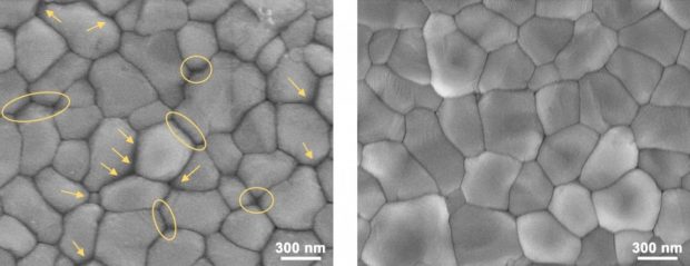 Mit sogenannten Perowskit-Solarzellen werden große Hoffnungen verbunden. Denn die benötigten Materialien sind sehr günstig und lassen sich mit geringem Energieaufwand verarbeiten. Gleichzeitig besteht die Chance auf enorme Effizienzsteigerungen, weil auch das blaue Spektrum des Sonnenlichts verarbeitet werden kann. Tatsächlich konnten mit Tandem-Solarzellen, die klassische Siliziumzellen mit den neuen Perowskit-Zellen kombinieren, bereits neue Rekorde in Sachen Wirkungsgrad erzielt werden. Das Problem allerdings: Die halborganischen Perowskite sind nicht besonders robust. Gleichzeitig müssen Solarmodule in der freien Natur aber durchaus beachtliche Belastungen aushalten. So werden die Zellen durch die direkte Sonneneinstrahlung teilweise auf bis zu achtzig Grad Celsius erhitzt. Nachts wiederum kühlen sie dann schnell wieder auf die Umgebungstemperatur ab. Diese massiven Schwankungen haben bisher bei Perowskit-Solarzellen zu Beschädigungen geführt. Was wiederum zur Folge hatte, dass sich die so gefeierte Effizienz im Laufe der Lebensdauer immer weiter verringerte. Links eine Solarzelle nach längerer Nutzung mit sichtbaren Beschädigungen. Rechts konnten diese durch den Einsatz des Polymers verhindert werden. Bild: G. Li/HZB Die Polymer-Moleküle bilden eine Art interne Schutzschicht Die Installation von Solarmodulen lohnt sich allerdings nur, wenn diese dann auch für rund zwanzig Jahre zumindest einen Großteil der ursprünglich vorhandenen Leistung erbringen. In diesem Punkt ist Forschern des Helmholtz Zentrum in Berlin nun aber ein wichtiger Durchbruch gelungen. Sie untersuchten zahlreiche Parameter und Prozessschritte im Detail und stießen letztlich auf ein Polymer namens b-pV2F. Dieses wurde in eine Vorläuferlösung des Perowskits integriert. Später zeigte sich dann, dass die Polymer-Moleküle wie eine Art Schutzschicht um die Perowskit-Mikrokristalle legten. Die enormen thermomechanischen Belastungen konnten so abgefedert werden. Getestet wurde dies unter durchaus anspruchsvollen Bedingungen: So mussten die neuartigen Zellen nicht nur 1.000 Stunden 1-Sonnen-Äquivalent-Beleuchtung aushalten, sondern auch mehr als einhundert Zyklen zwischen plus achtzig Grad Celsius und minus sechzig Grad Celsius absolvieren. Dies entspricht in etwa der Belastung von einem Jahr Dauereinsatz. Das Ergebnis: Die Leistungsfähigkeit lag am Ende immerhin noch bei 96 Prozent des Ausgangswertes. Das Ende der Entwicklung scheint noch lange nicht erreicht Rechnet man diese Verluste weiter hoch, liegen sie natürlich noch immer deutlich zu hoch für einen zwanzigjährigen Einsatz. Die Verbesserungen gegenüber den bisherigen Ansätzen sind aber so enorm, dass die Forscher optimistisch sind, die Lücke perspektivisch noch weiter schließen zu können. Zumal der Einsatz des Polymers noch einen zweiten Vorteil mit sich bringt: Die darin enthaltenen Dipolketten verbessern den Transport von Ladungsträgern. Oder anders ausgedrückt: Die Effizienz der Solarzelle erhöht sich. Tatsächlich konnte im Labor eine entsprechende Zelle mit einem Wirkungsgrad von 24,6 Prozent hergestellt werden. Dies stellt für die sogenannte p-i-n-Architektur einen neuen Rekordwert dar. Auch hier scheint das Ende der Fahnenstange aber noch lange nicht erreicht zu sein. Zumal der Wirkungsgrad im Rahmen einer Tandem-Solarzelle vermutlich sogar noch einmal deutlich höher ausgefallen wäre. Die Forscher haben ihre Ergebnisse im Fachjournal Science veröffentlicht. Darauf können nun Wissenschaftler in aller Welt weiter aufbauen. Via: Helmholtz Teile den Artikel oder unterstütze uns mit einer Spende. Facebook Facebook Twitter Twitter WhatsApp WhatsApp Email E-Mail Newsletter